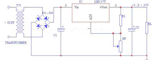 CW117为三端可调正输出集成稳压器,输出电压可调范围为1.2—37V,输出电流可达1.5A,其1脚为调整端,2脚为输出端,3脚为输入端。